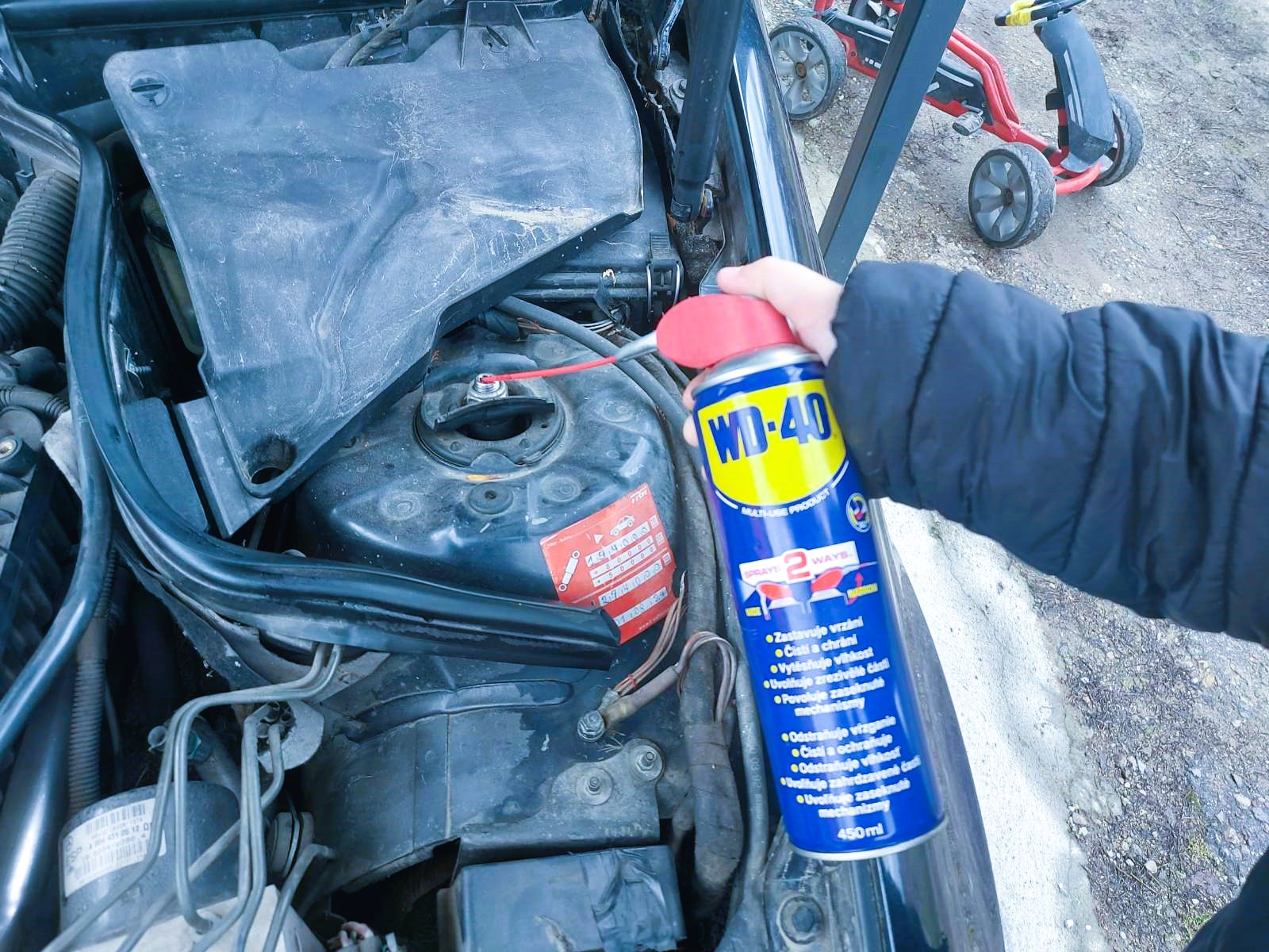 Током замене амортизера наишли смо на проблем – запекли шраф који није хтео да попусти. Након неуспелих покушаја, употребили смо WD-40 са прецизном цевчицом која омогућава да средство делује тачно на место проблема. Убрзо је шраф попустио.